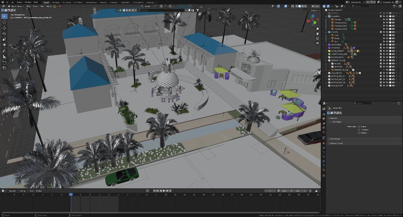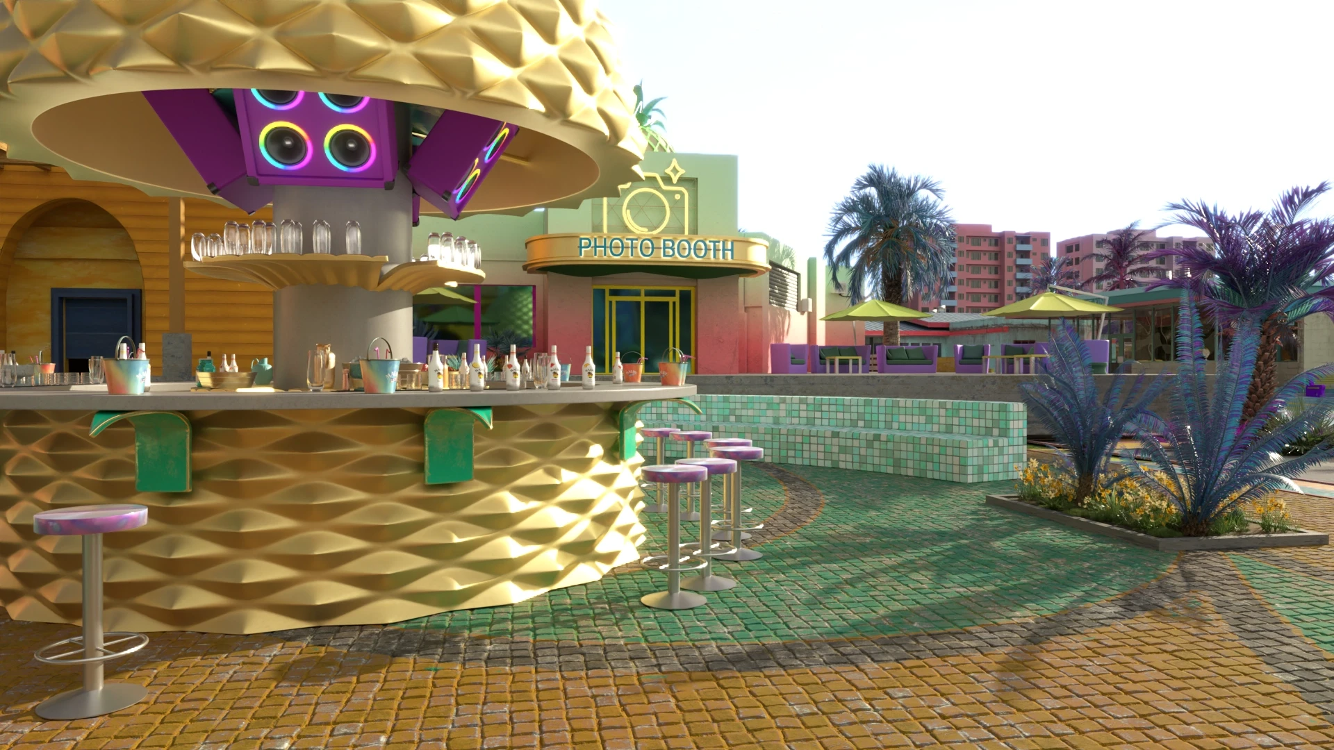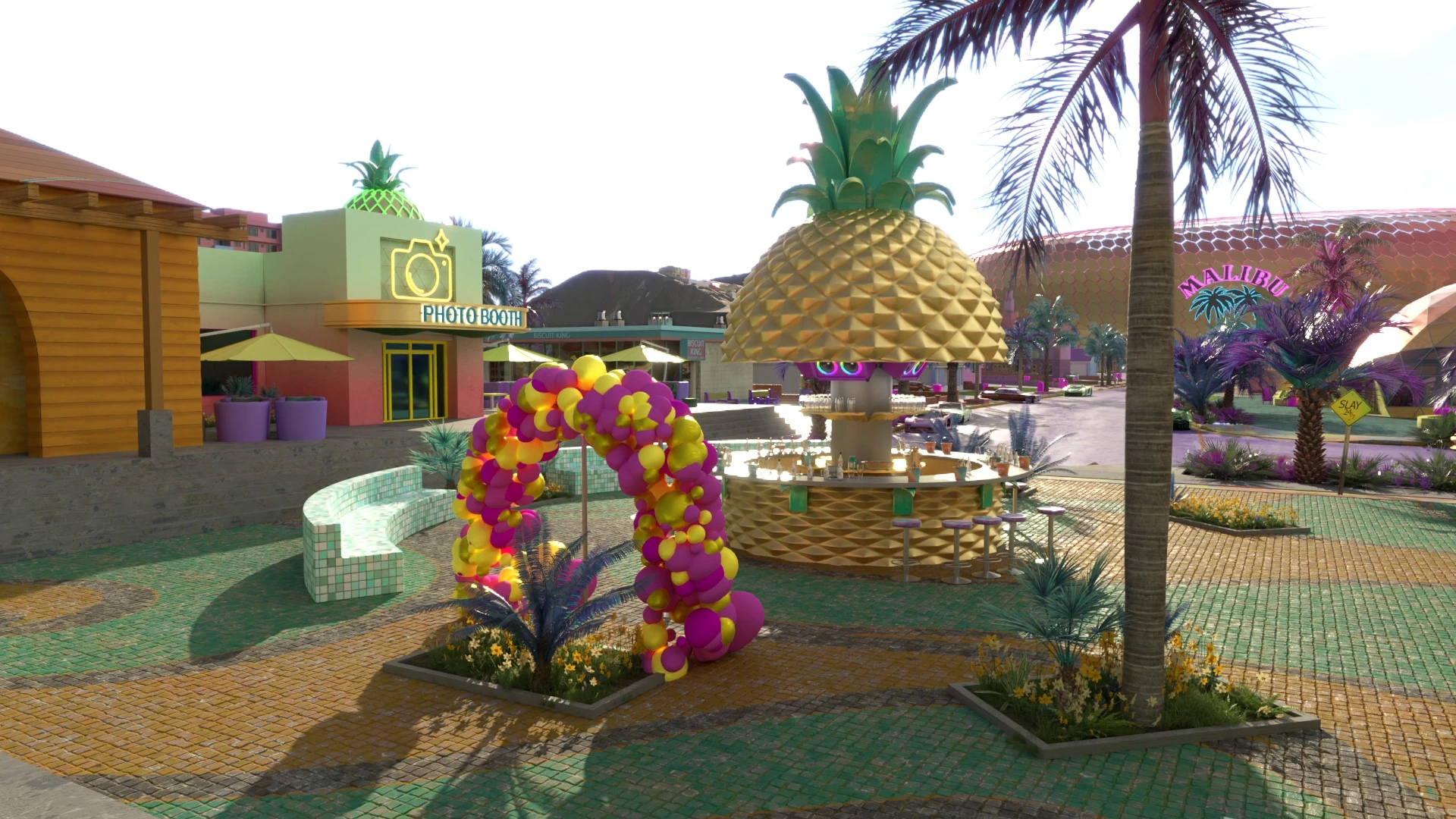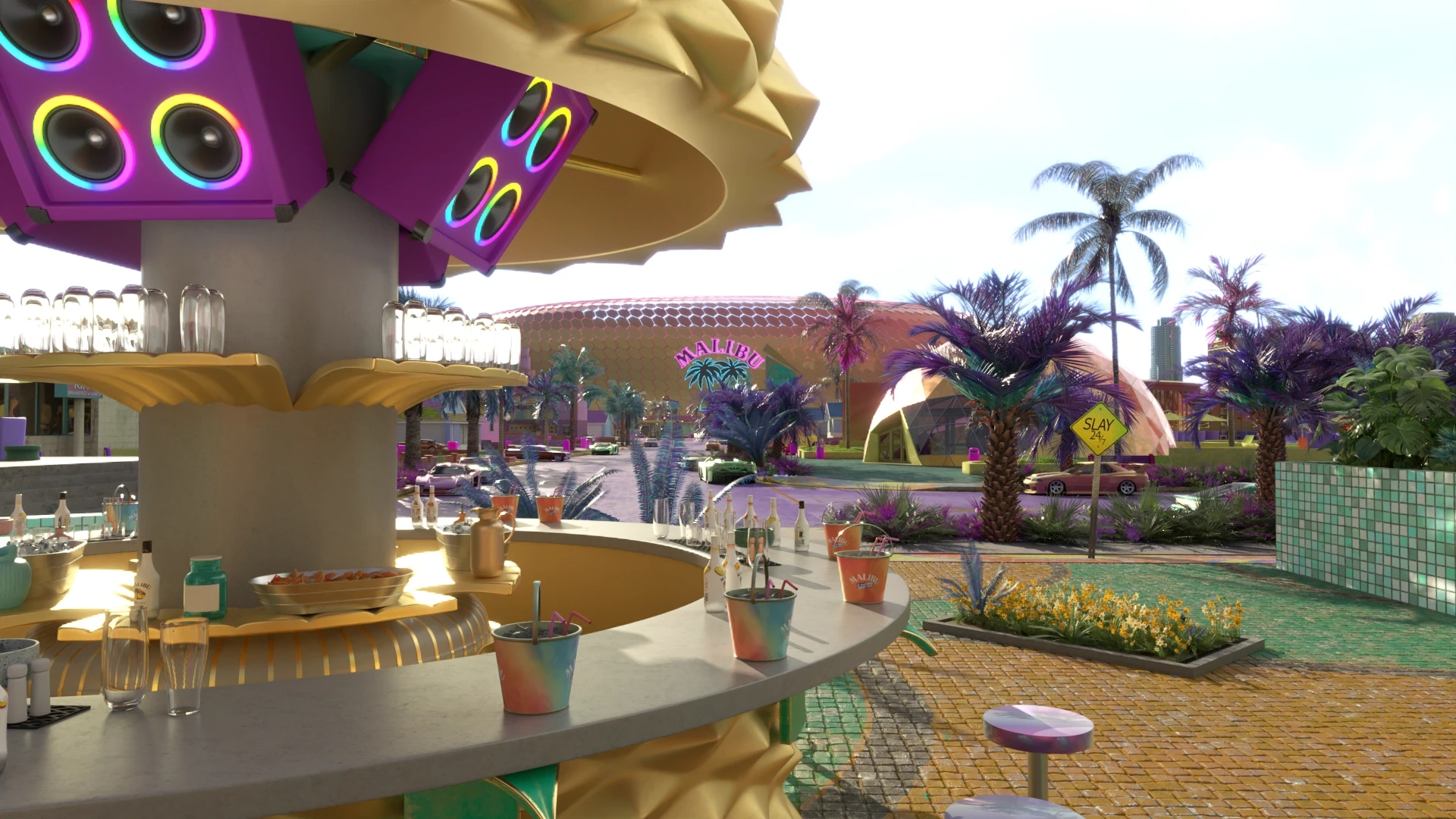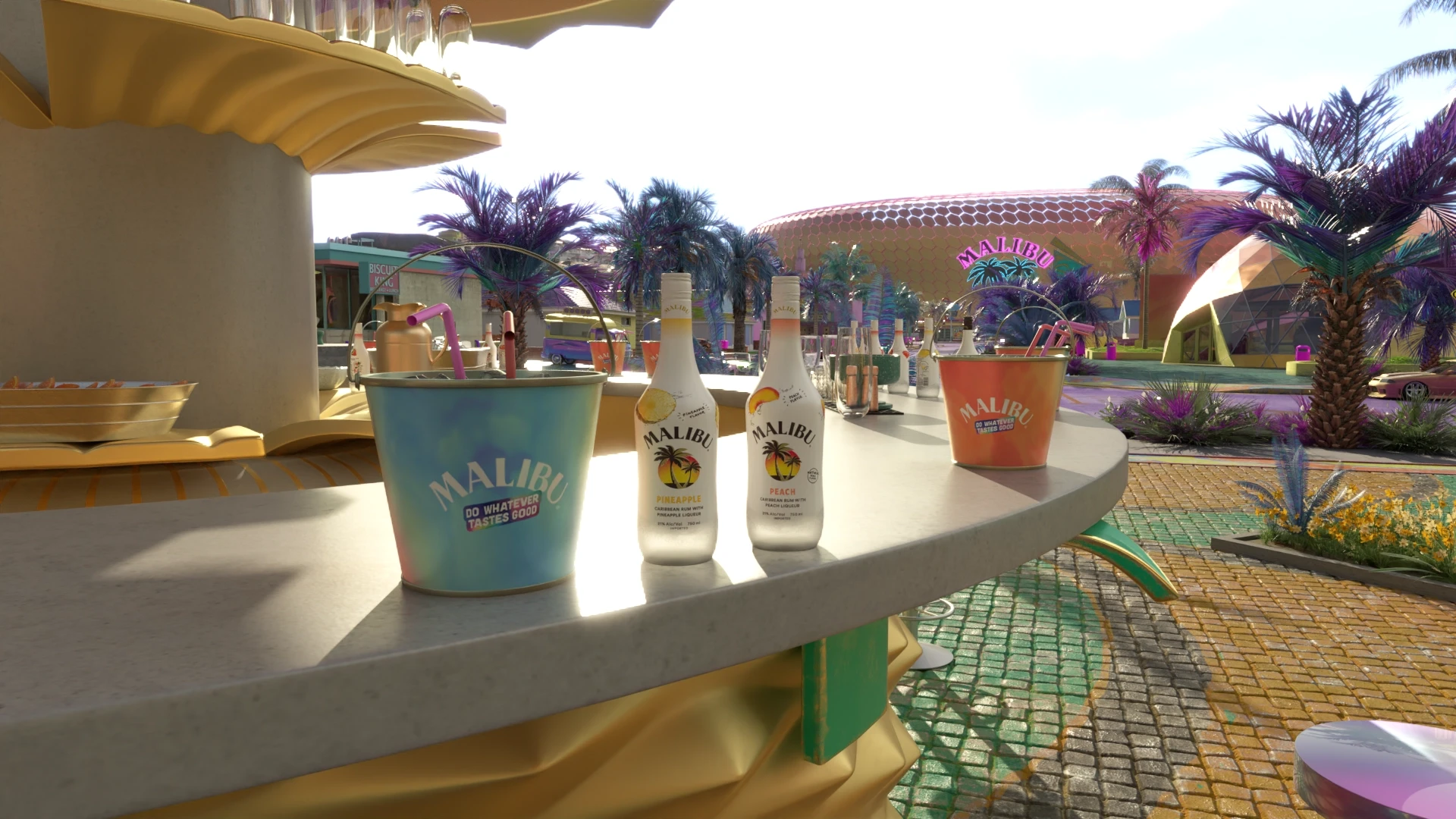 The surrounding elements were sourced from the Malibu Ad Campaign, and I expertly modeled and textured the square and bar to seamlessly integrate with the environment, creating an engaging space for users to interact with various elements within the bar.